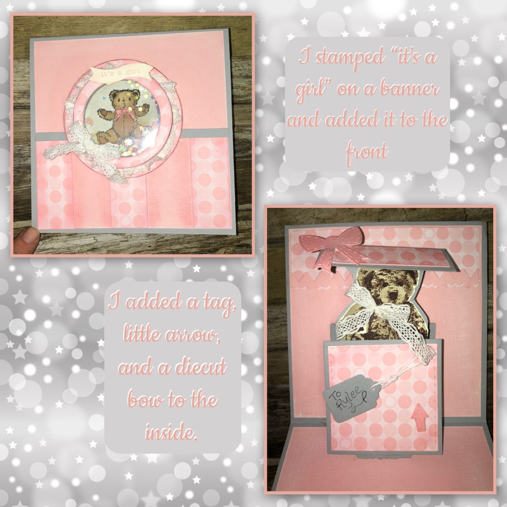 I’m excited to share this card, it’s a little late but I made it for my FIRST grandchild, I wanted it to be special and I just got so stuck in my brain that I had a hard getting this started. Sooooo when I was coming up with a card for this challenge I used it to get my self rolling on this baby card. This weeks challenge is a design challenge, so I used the following image to inspire me on this card front. I did change the square for a circle but other wise I think I kept it pretty close to the image.