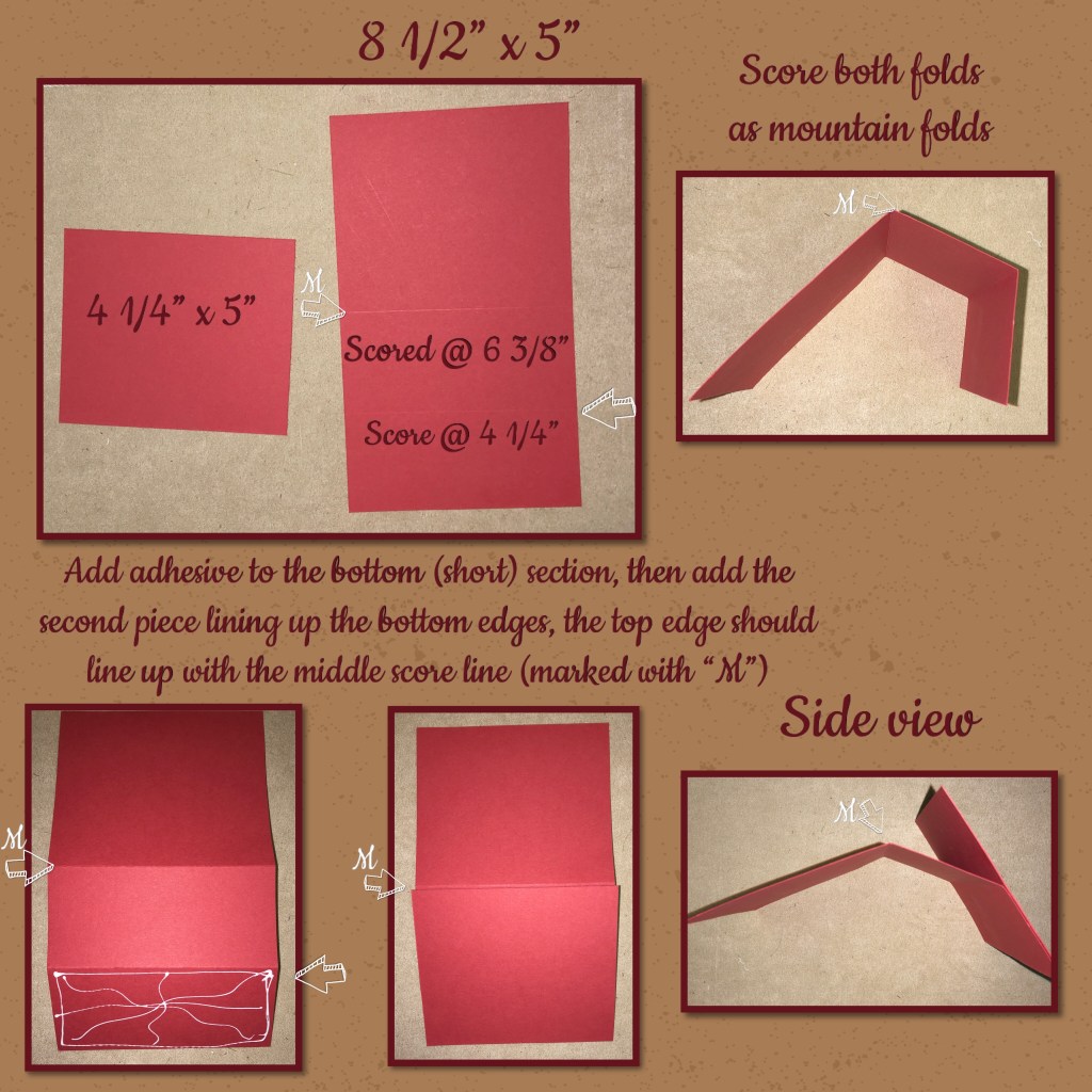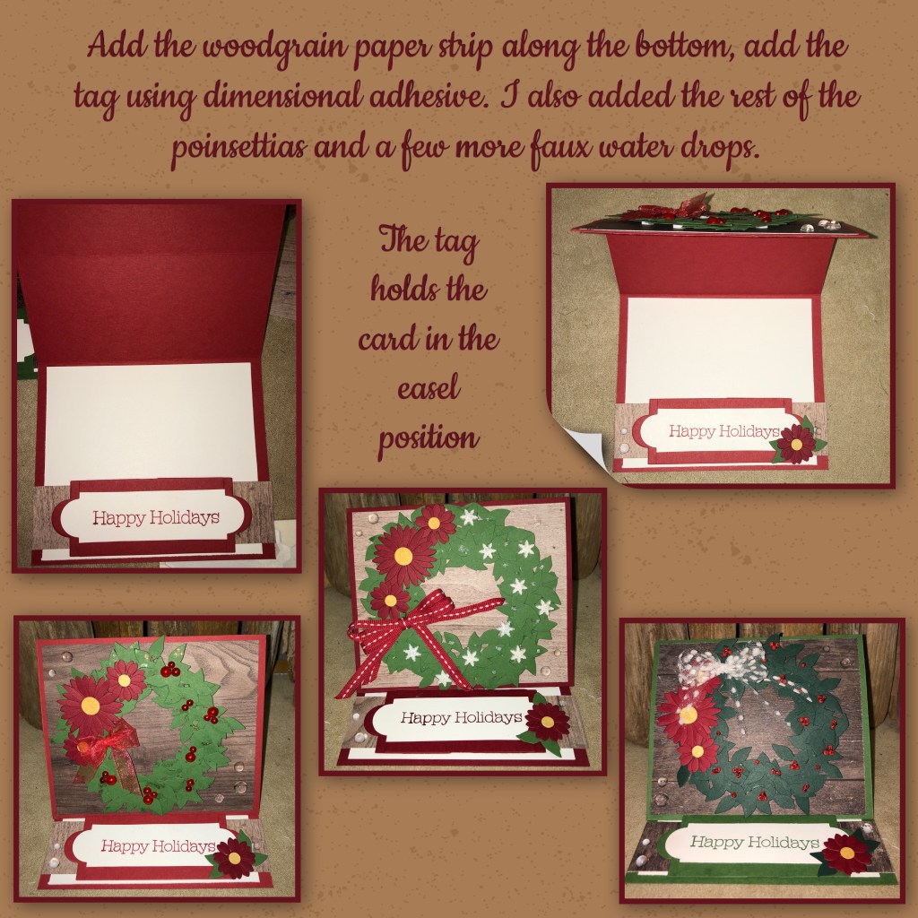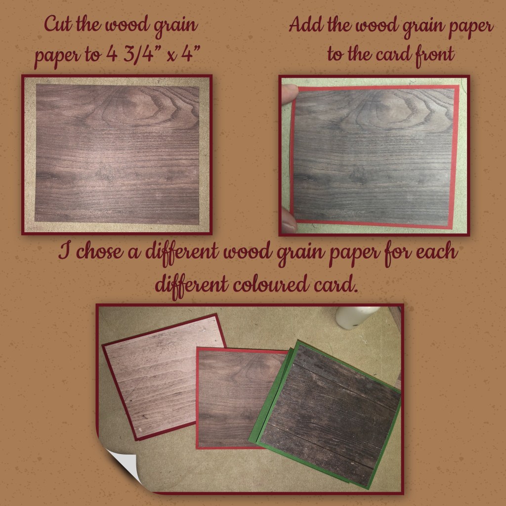 All the card stock is from Stampin’ Up!, the colours used are Garden Green, Handsome Hunter, Ridinghood Red, Cherry Cobbler and Whisper White. The wood grain paper is also from Stampin’ Up! but it is currently retired.