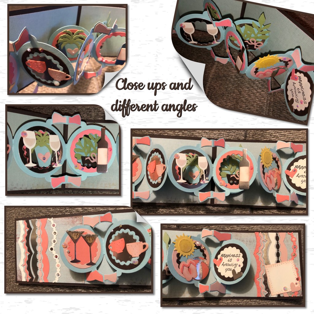 To make all the die cut decorations I used Karen Burnistons Party Border Blends, Wine Charms, Beach Charms, Happy Hour Charms, Coffee Charms, and the decorator pieces from the Circle Tag book set which was used to make the card base.