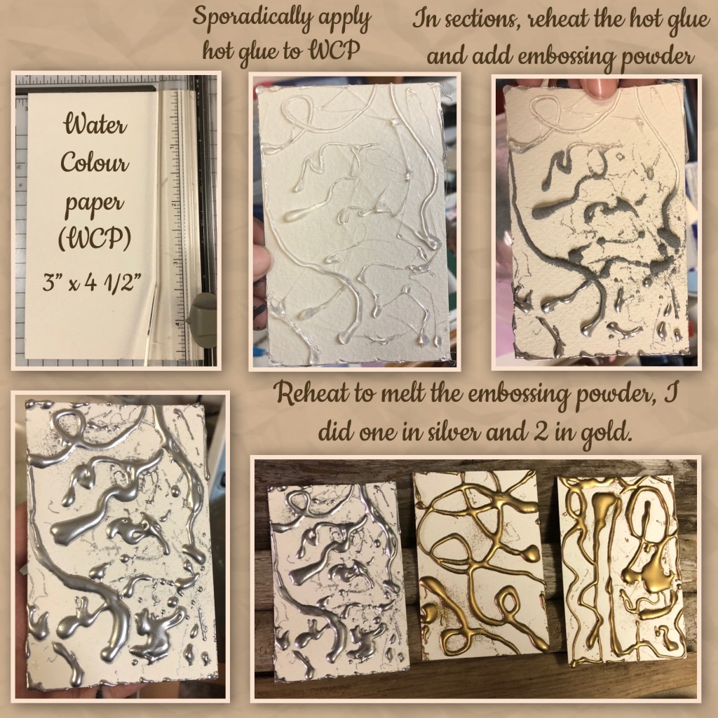 The neat thing about the technique I used to make these cards is that I used hot glue, yes plain Jane hot glue……. I also used a heat gun to reheat the sections to get the embossing powder to stick, then melt.