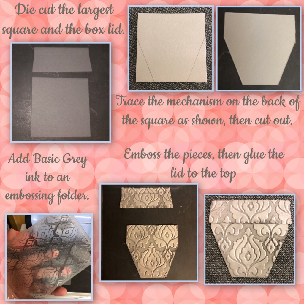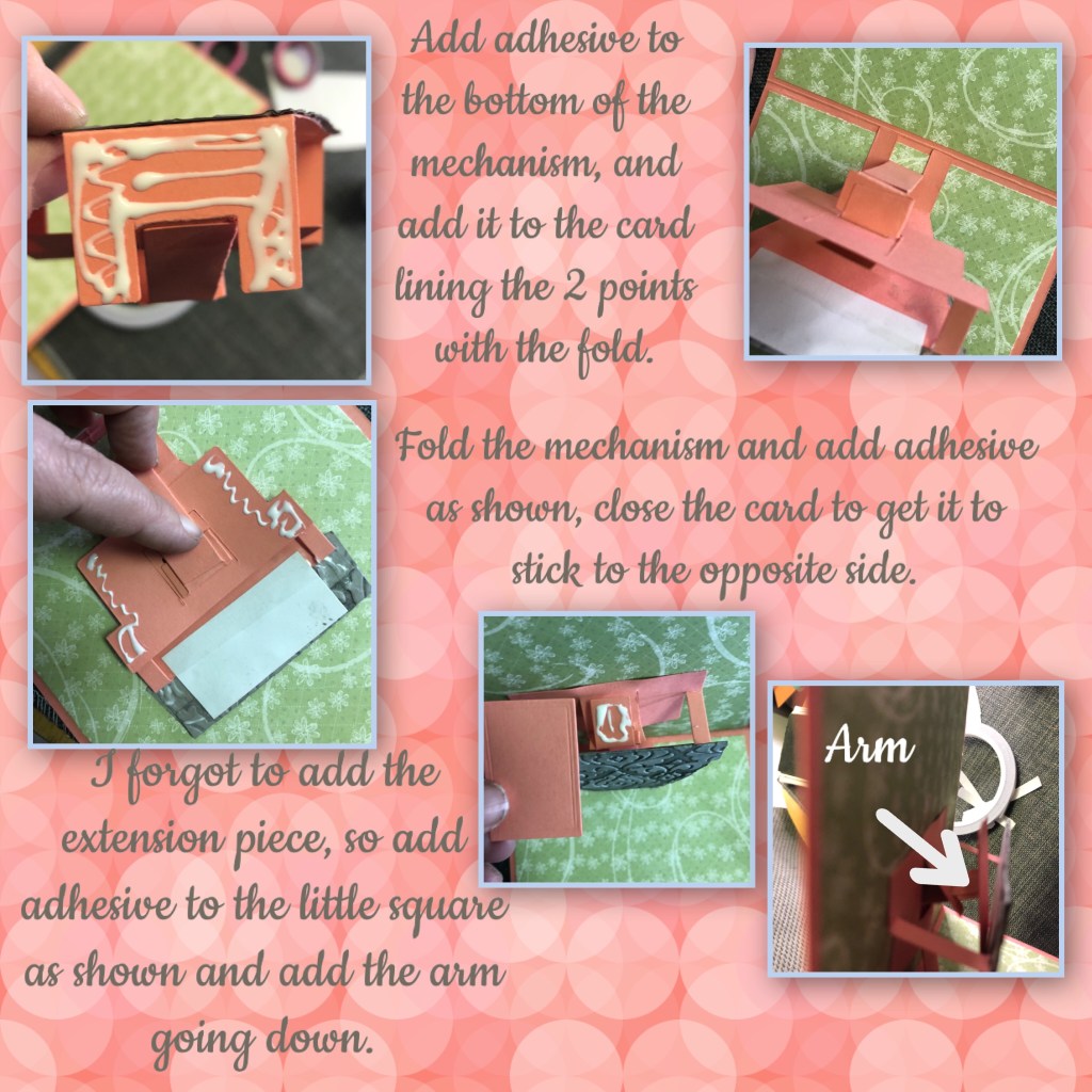 The dieset I used for the mechanism is the Parcel Pop up from Karen Burniston. I have photos below showing the progress, but I recommend watching Karen’s tutorial as it is kind of complicated to just describe in Photos it can be found on here