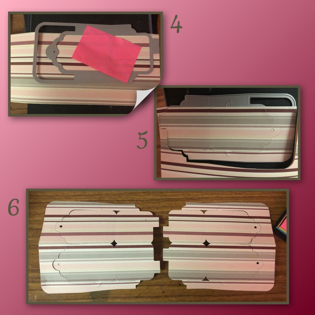4- I chose a striped pattern paper, and folded it in half, take the die that cut for the mechanism, and line up the top cutting edge of the dye just above the fold, as shown in the photo above. Probably a good idea to tape it down