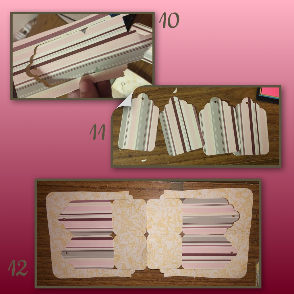 7- I like to place the panels on top of each other facing each other, (the yellow pattern is the back side of the striped paper)making sure the tags are perfectly aligned. Then I will fold the little tabs.