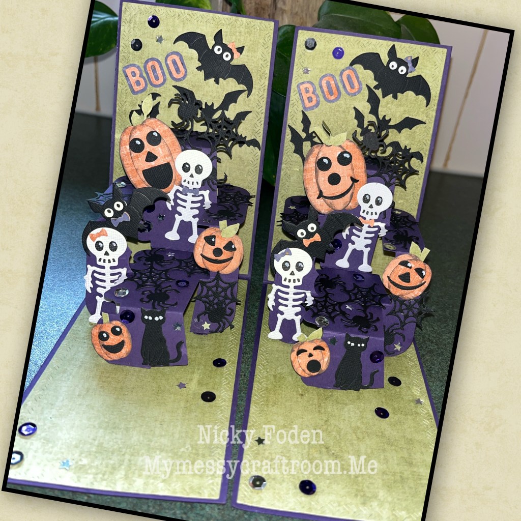 IT’S SNEAK PEAK TIME, and I’m so EXCITED. I made a few cards and I had a hard time choosing which one to post first. I decided on this one because it uses 3 new products so it’s 3 sneak peaks 😁. This adorable Skeleton from the Skeleton and Bats set, the Slim Pattern Plate- Spiders, and the Slim Pattern Plate – Bats. All the dies used for this card are from Karen Buriston, I will list them as I go, and all the links will be at the bottom of this post. I cut enough pieces so I made 2 cards. The front of the card is a shaker, with a skeleton, I didn’t want him to get stuck upside down so I added him to a thread so he could glide up and down with out the possibility of him flipping upside down. Links are at the bottom of the page