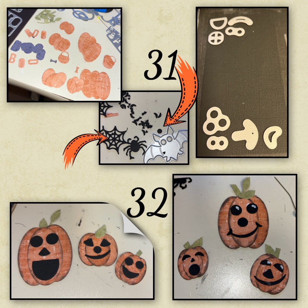 31- I die-cut pieces from the Surprise Ball, the Bitty Ball, Mini Ball add on Monkey and Lion, the leaves are from the Flip Frame pop-up, and I cut the BOO from the Mini Alphabet set. The confetti from the spider web and bat were also used for some of the smaller Jack-o-lantern faces.