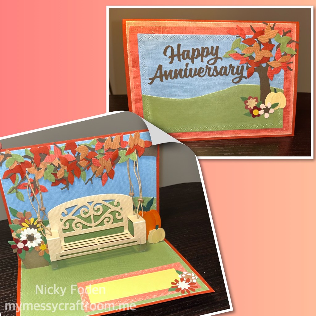 Yay, its that time again, it’s the Karen Burniston October Designer challenge, and this month’s challenge is to make either a Halloween card or a Fall-themed card and I went with a fall-themed card. I have a co-worker who needed an anniversary card, and he also was requesting a card with fall colours, there was also talk of there possibly being a wooden bench swing for a gift so I challenged myself to make the Karen Buriston Garden Bench popup into a swing, and the results turned out better than I thought it would.