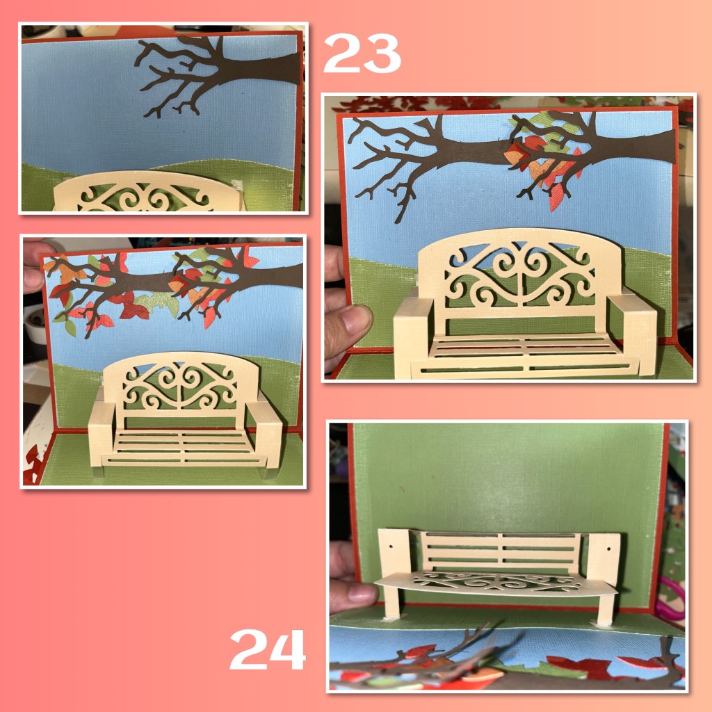 16- so I followed Karen Burnistons direction with how to install the new bench thinking it would be the same. I folded the bench into the fold then adhered the top then the bottom but adding adhesive to the tabs that I had made. In theory, this should have worked. So I’m not sure if the measurements of both benches are slightly off or if I misjudged the tabs but it didn’t fold right so I had to pull the top tabs off, then folded the bench down into the closed position keeping the bottom attached. Re-added adhesive to the top tabs then closed the card so the tabs would now attach in the correct position