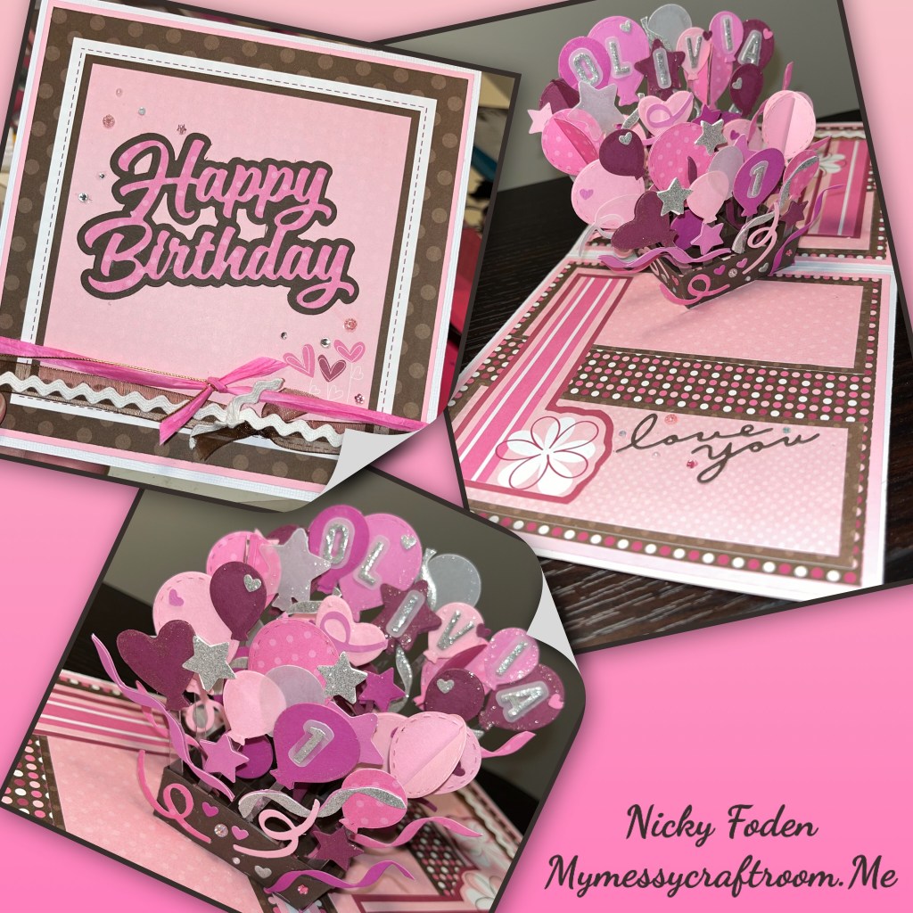 Sorry I’ve been MIA, I have had a crazy month. But I am pretty excited to share this card. When I originally saw this card from Sandy Diller I knew I just had to give it a go. Sandy made it as a mini slimline card but I wanted to go bigger. If you check out Sandy’s card she has a great video and she explains how to alter the mechanism used so it would fit in a mini slimline. I didn’t have to alter the shape like she did because I made my card 6” x 6”. Both cards have a great balloon surprise when you open the card.