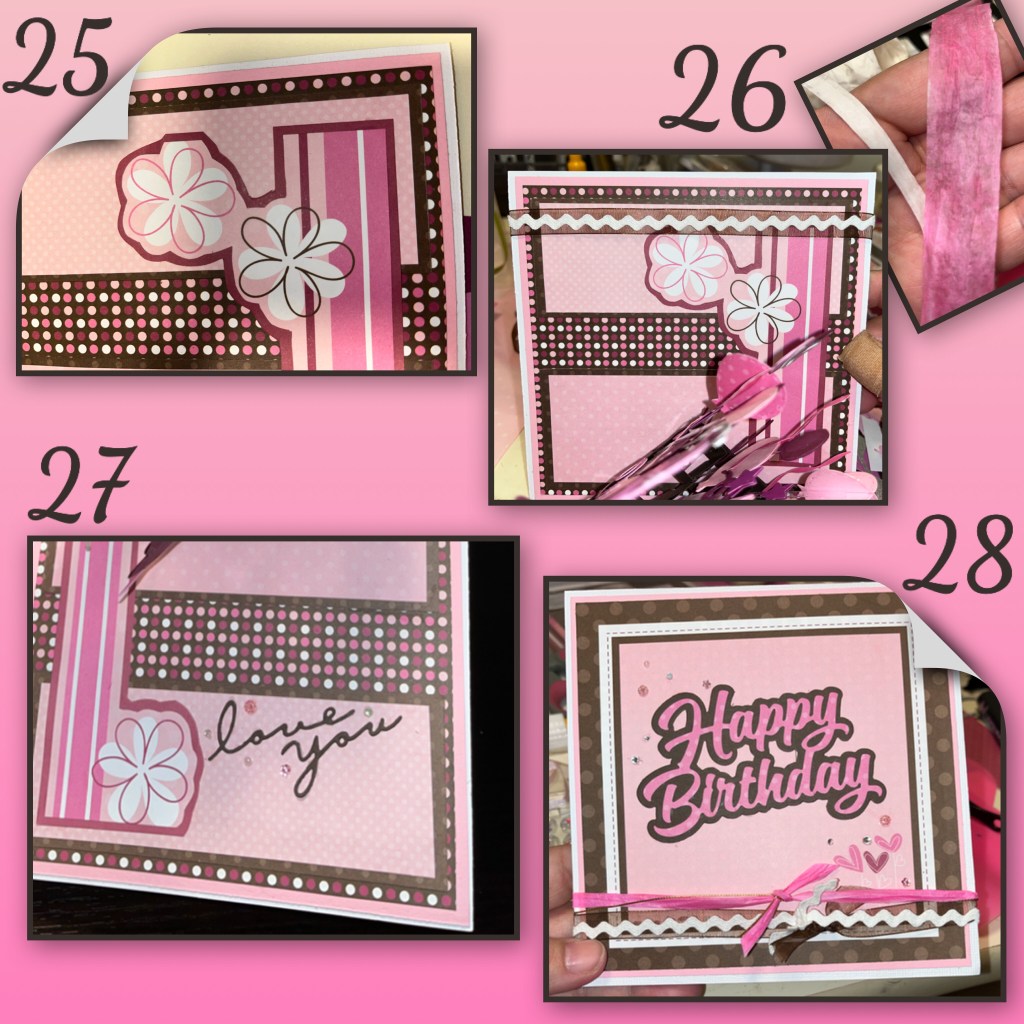 26- added ribbon around the card to cover the the flower. I ended up adding the pink pieces as well.