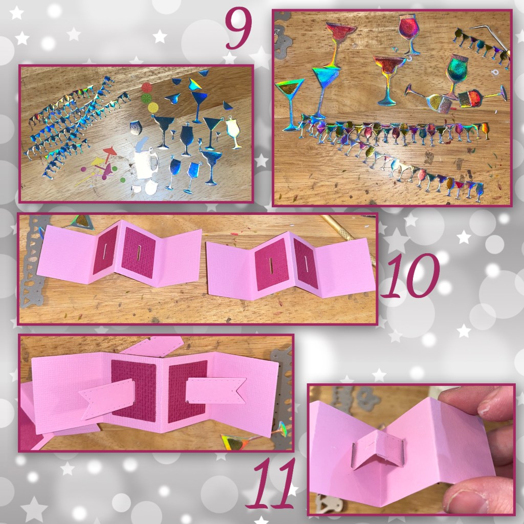 9- diecut the cocktails from the Happy Hour die set and the cocktails border from the new Beach Borders dieset from holographic cardstock. The lemon/lime/orange/ wedges, umbrellas are cut from cardstock. I coloured in the beverages with sharpie markers to get the bright vibrant colours.