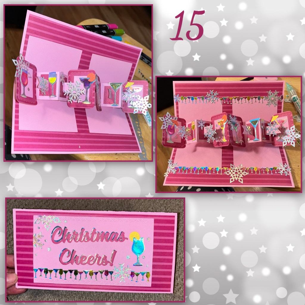 15- now time to decorate, I added all the pieces that I have diecut above, and also some holographic snowflakes left over from another card. On the front I diecut Chirstmas, from the Merry Christmas dieset and Cheers from the Cheers set, I gave them both a holographic shadow. The little sparkles that are around are the confetti bits that came out of the snowflakes.