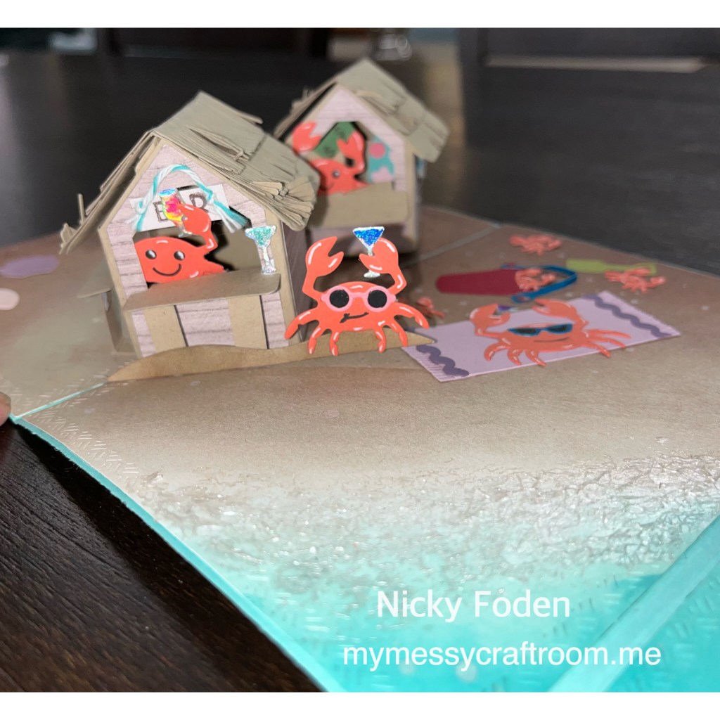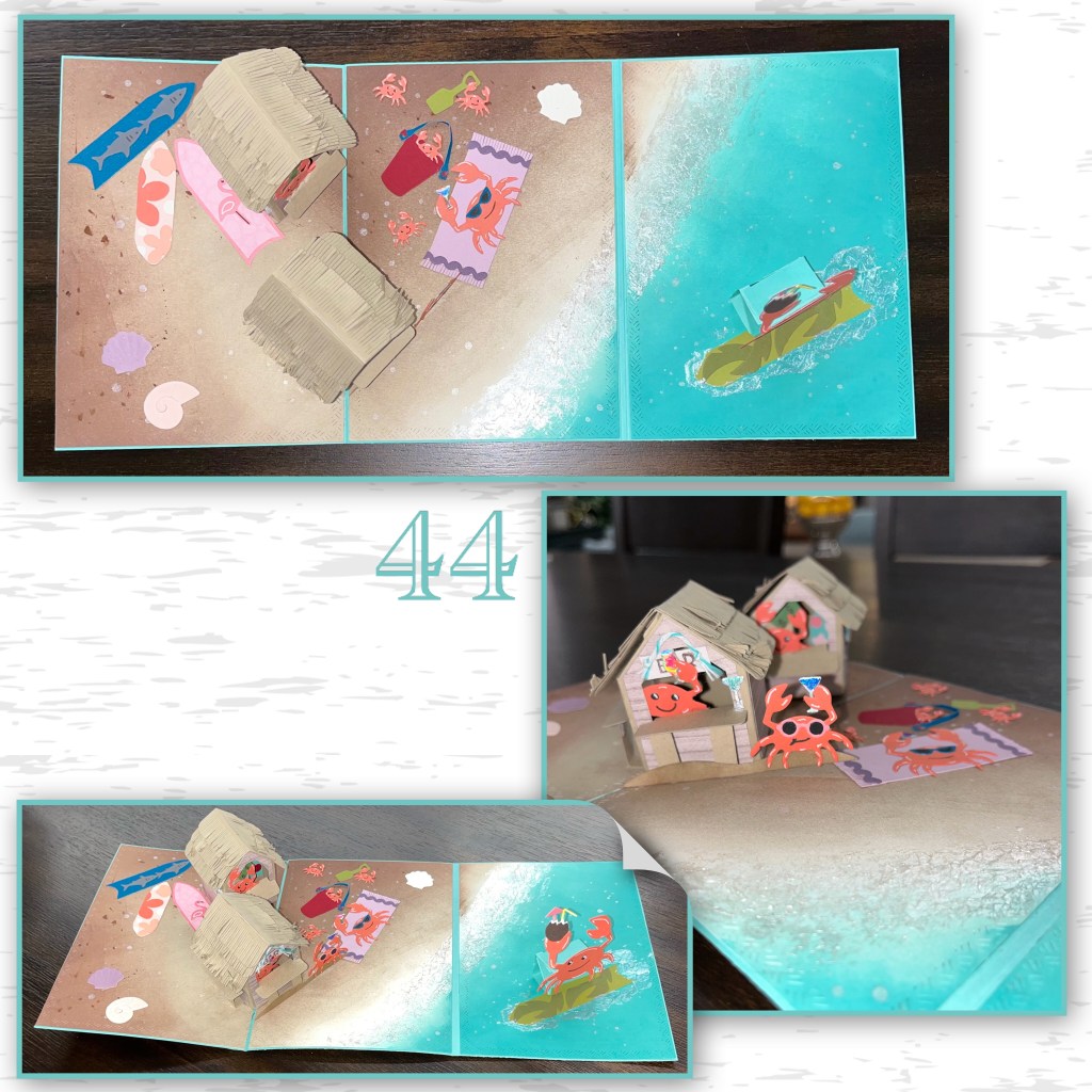 37- add the surf shack to the card by it’s flap on the left side. I originally wanted it closer to the water but it wasn’t popping open with one bam box so I had to remove it to add the second bam box.