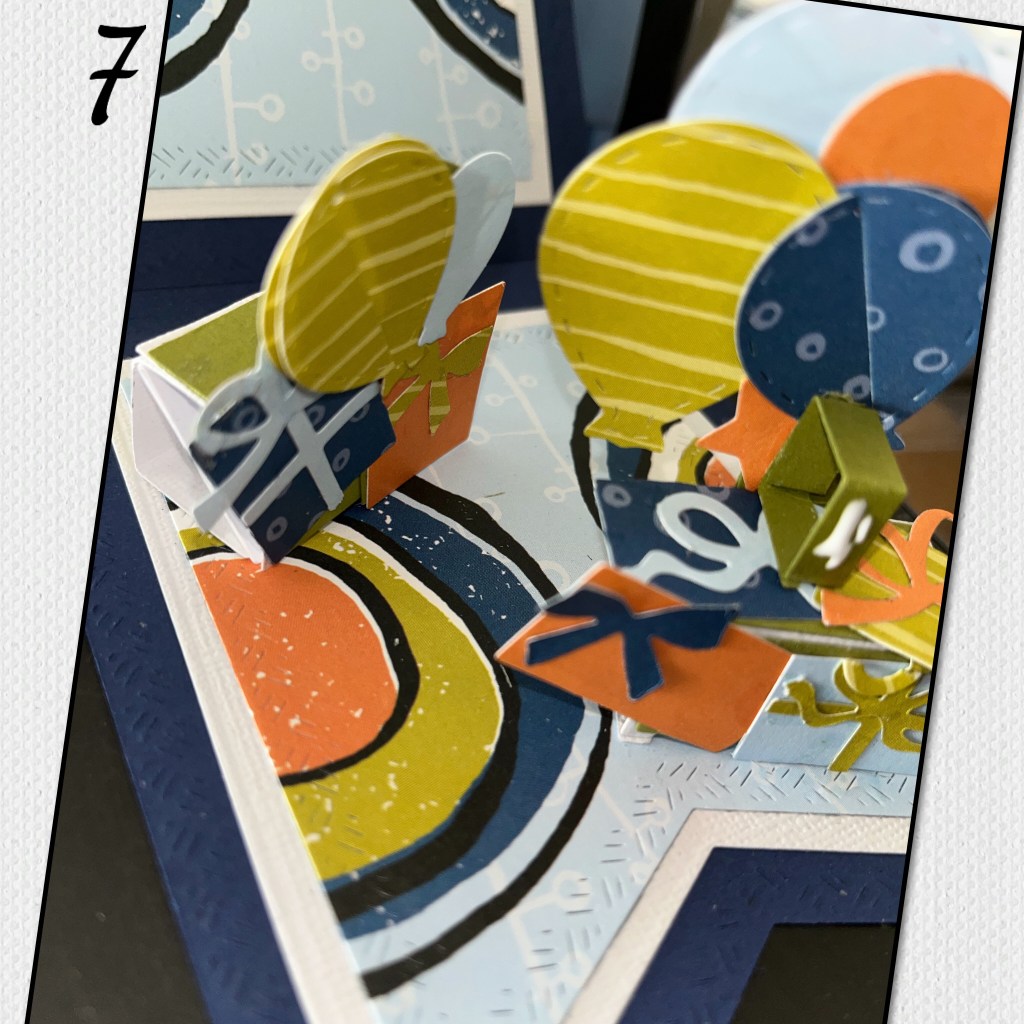 4- diecut balloons from Balloon Collage Add On, and gifts from the Gift Pivot Panel from coordinating double sided paper.