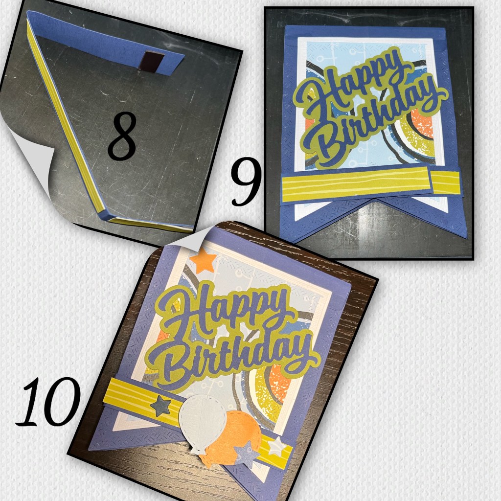 1- using the Banners Crosshatch I cut the layers of the card base. Blue is the base, white is for the front, back and inside, patterned is for the front and inside. I cut out and assembled 2 Bam Boxes. I cut out 2 hinges from the Tagbook pop up and the Happy Birthday and the Happy Birthday Shadow