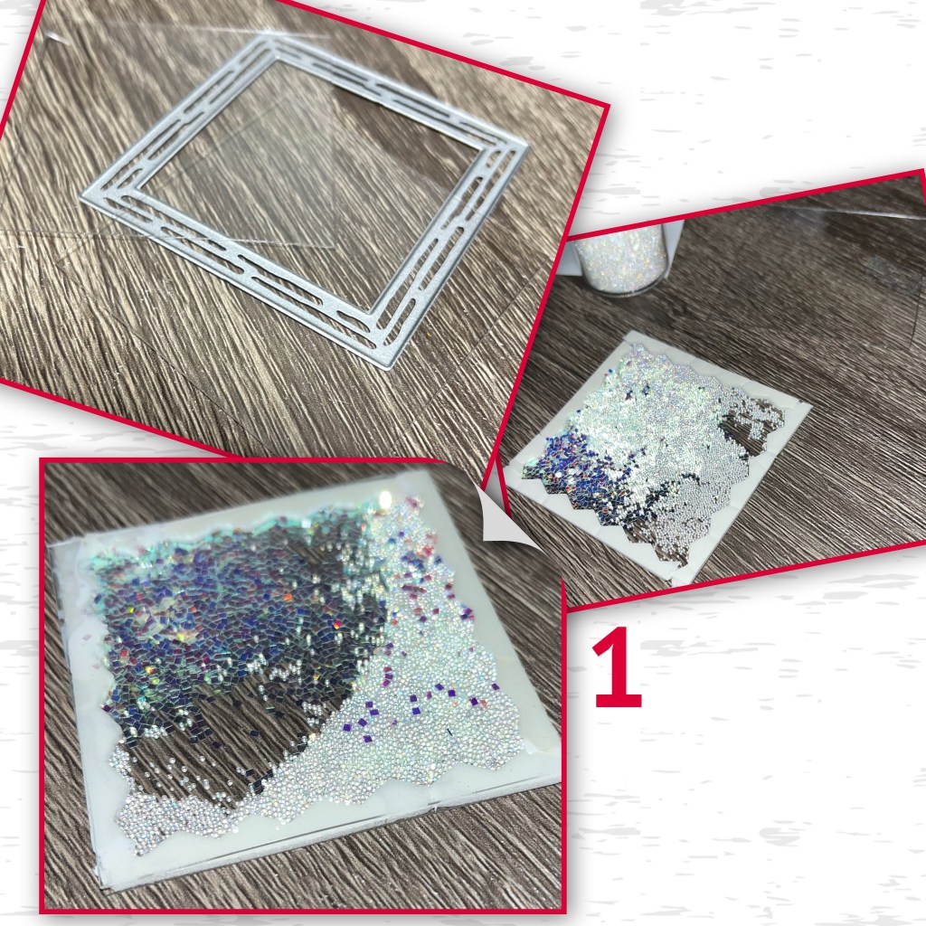 1- I cut 2 pieces of clear plastic so that it would fit inside the Frame die that I was going to use at a later step. Believe it or not but this plastic is from the cover of a Costco Muffin container lol. I used some foam adhesive around the edges of one of the clear squares and filled with itty bitty sequins and micro beads. I added the second clear square to close the shaker box.