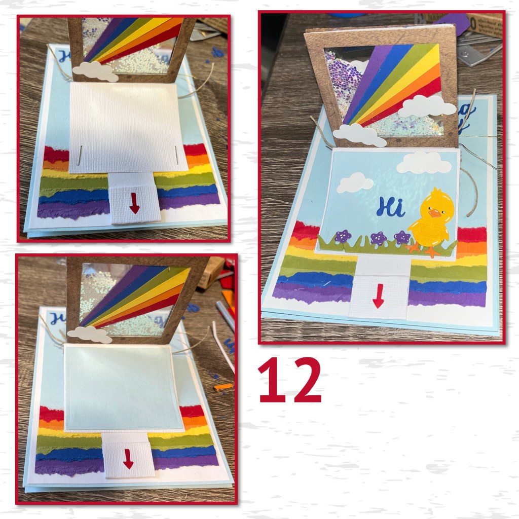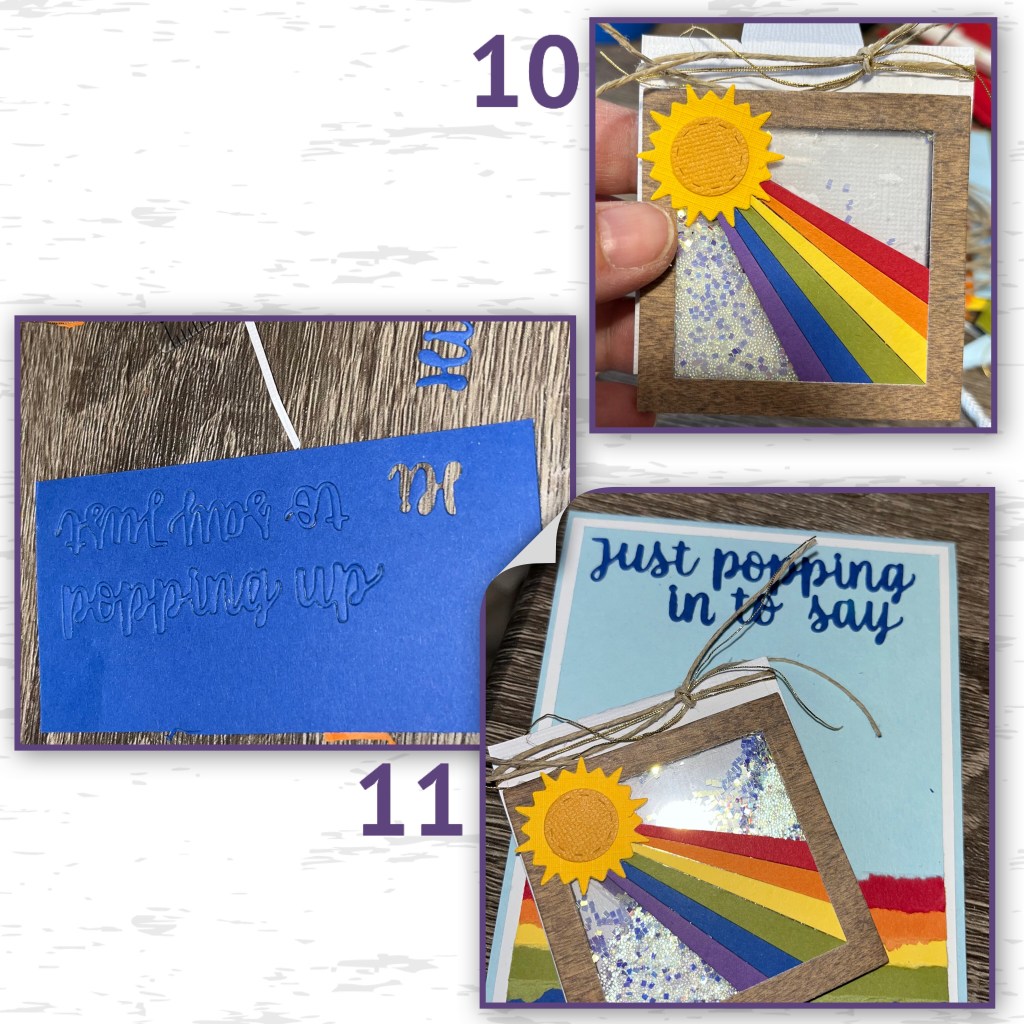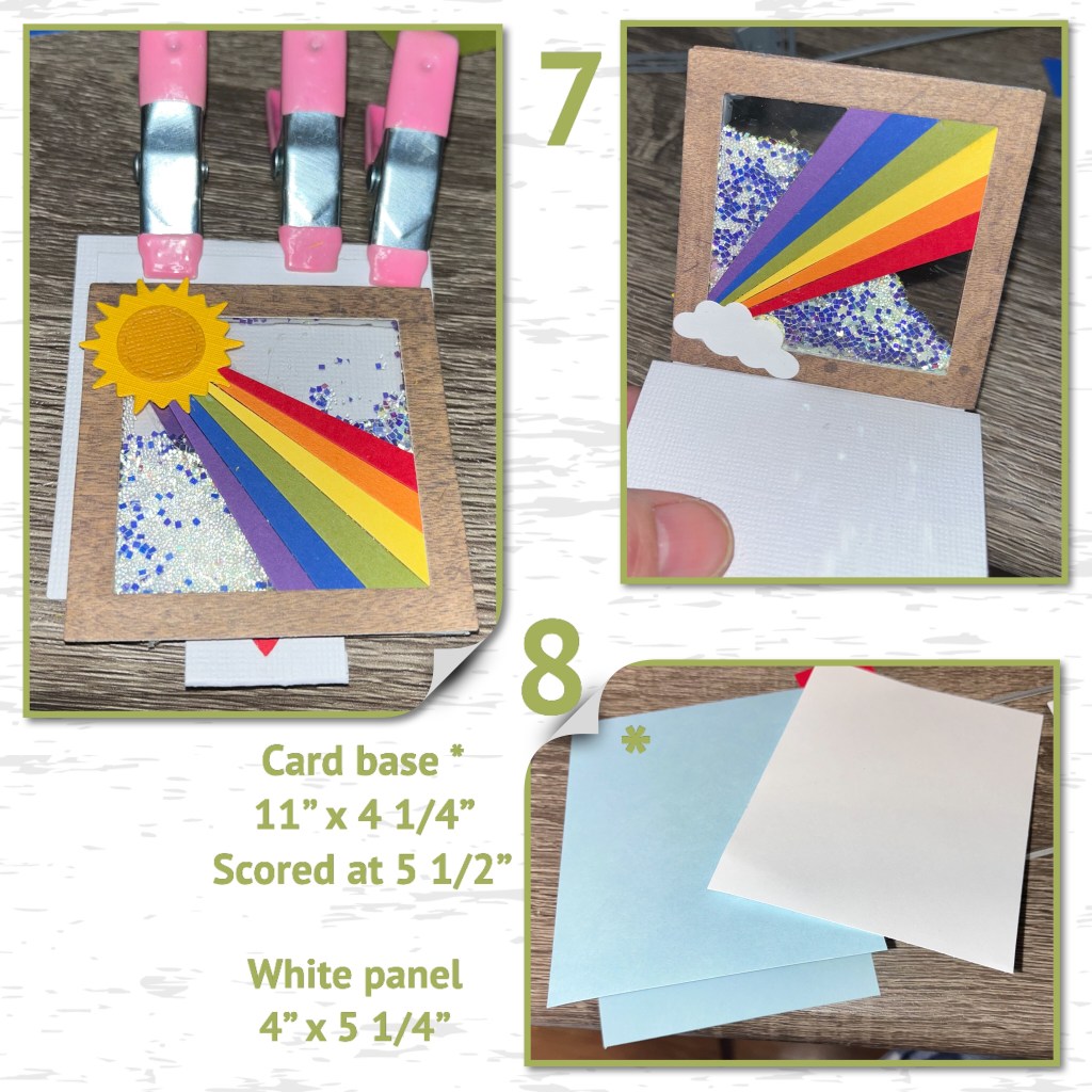 7- the sun is from Tropical scene die set, and the clouds are from the Castle Pop up. When you add the paper frame on the inside, add it after you attach the shaker to the mechanism, then the mechanism piece will be sandwiched between shaker and the frame.