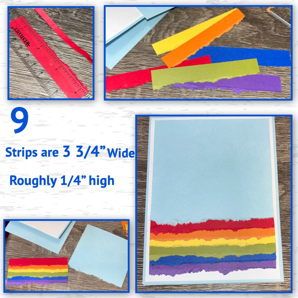 9- cut the rainbow strips as described below. The sky is the same width as the rainbow, but I ripped it to fit once I saw how much of the space the rainbow took. Add to the card front.