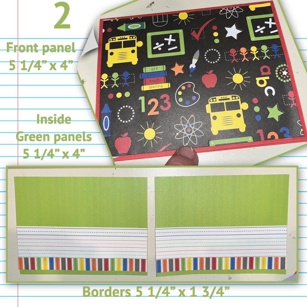 2- the card base is 5 1/2” x 4 1/4”. Cut the panels for the front and inside but don’t adhere on yet. The paper pack is retired Creative Memories