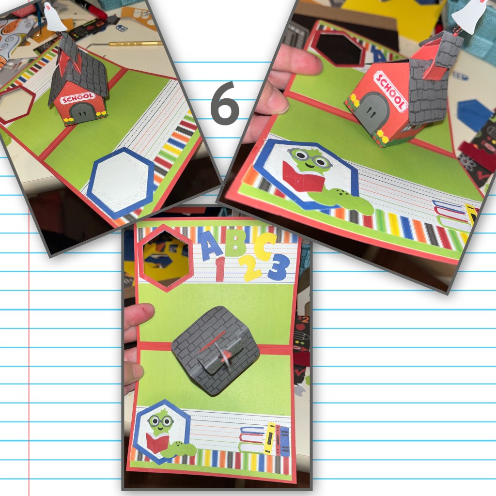 3- adhere the panel that will be on the inside left. Next lay the school in where it will go on the right side (don’t adhere in yet) lay the small hexagon down face up with adhesive on the back facing up. Close the card, the hexagon will stick to the left side. Die cut the window. Add the front panel. Lay the small hexagon inside the first cut and diecut again to cut through the front layer