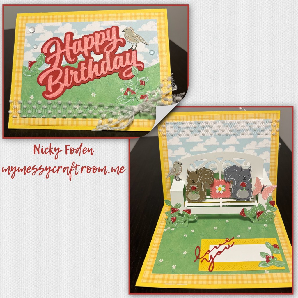 My card of choice is “pop up” , I used strawberry fields colours, my bench is my chair, and I used yellow plaid. Here is my card.