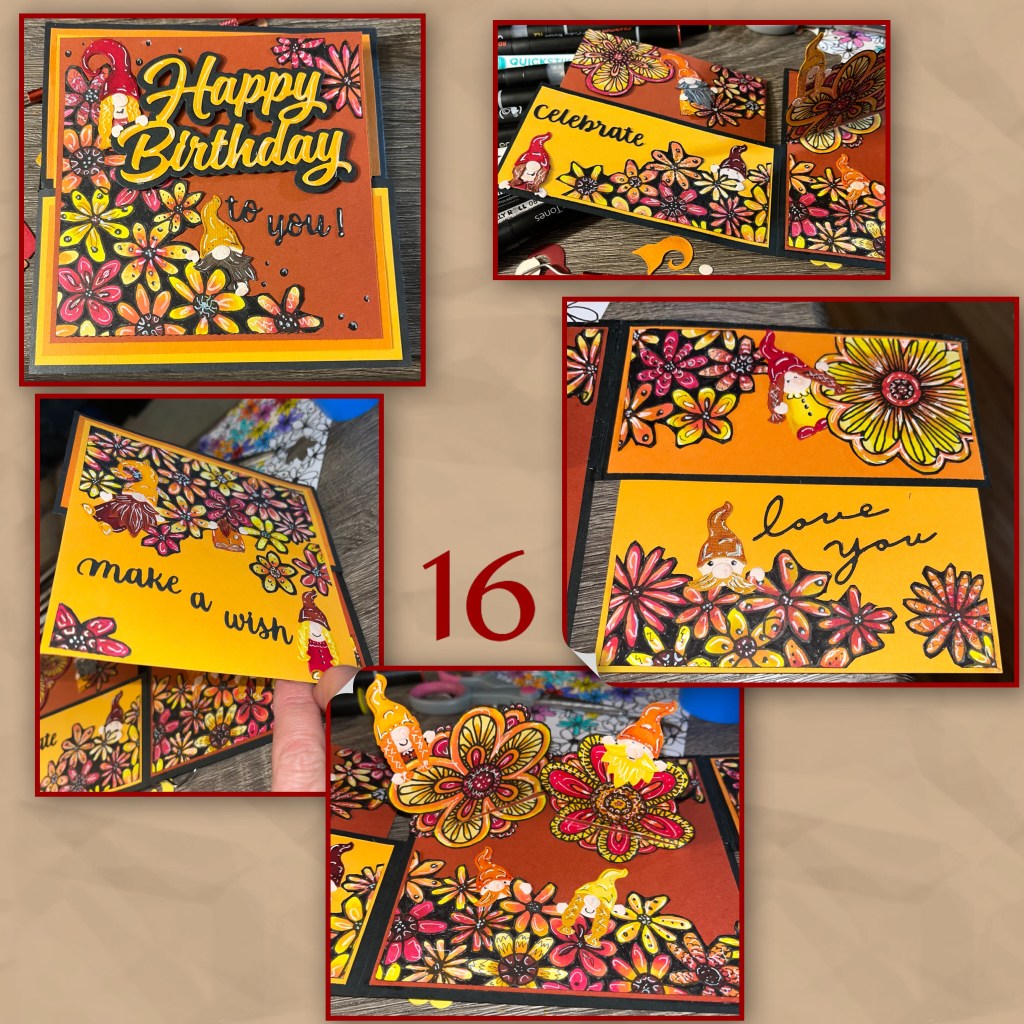 It’s Craft Roulette time, I actually just got the card done in time for the Sunday night deadline, lol, so I didn’t get my blog post done until now. I found this weeks parameters a little bit tricky. Parameter 1- was a Dutch Door card, meaning the front had to be split having a top and a bottom. I chose to have my bottom open to the left and my top open to the right. Parameter 2- the colours had to be campfire colours, Parameter 3- had to be a page from a book and Parameter 4- it had to have a hat or cap. My gnomes are all wearing hats, but I could not cut a page out of a book. So I decided to take a page out of a colouring book, and colour the flowers in yellows, oranges and reds. I donβt colour often so this was my time consuming part lol, Iβll explain more in the details below. And of course my own parameter was to make a pop up card.