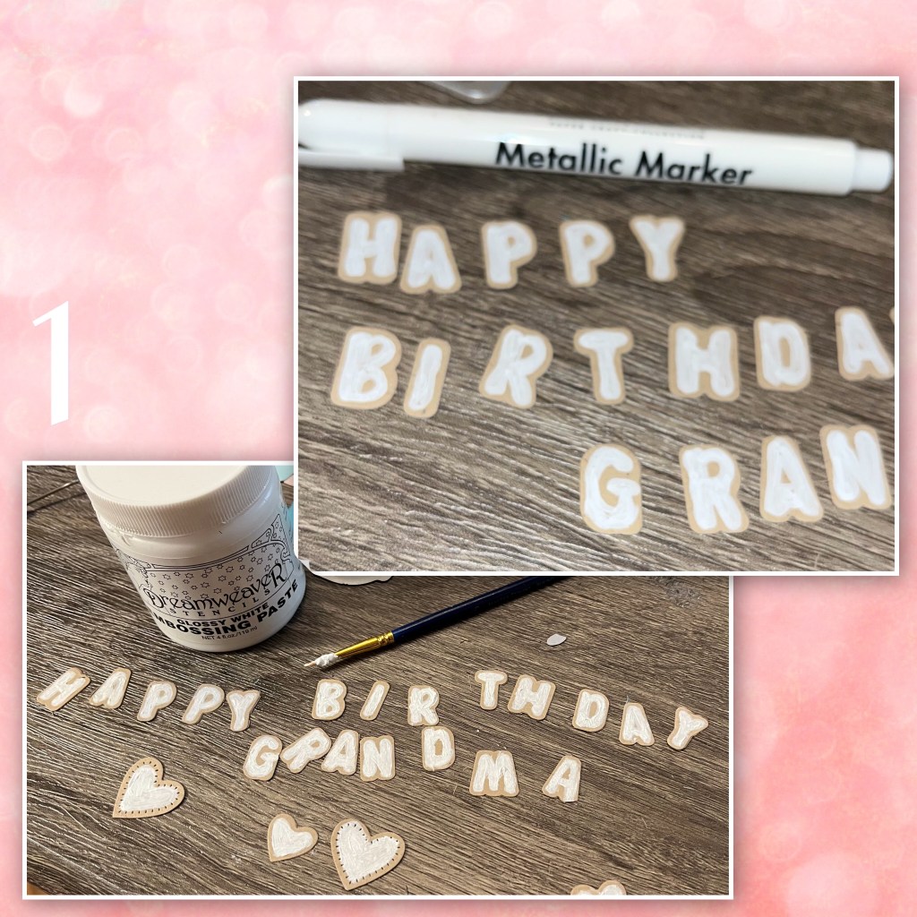 1- to make the word cookies I used the shadow dies from the Mini Alphabet and Numbers . I used the Metallic White marker to colour in the “icing” I chose this marker because the ink sits on top of the cardstock and it fills in nice. I then decided to go over with white embossing paste, and a small paint brush to give it more of an icing look. I just grabbed a couple of hearts, I think from the Heart Collage Pop up.
