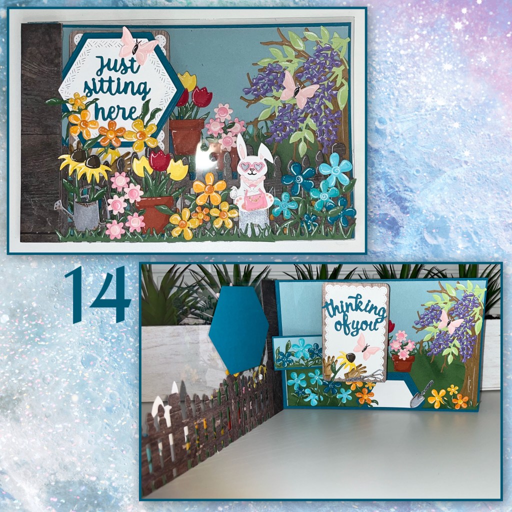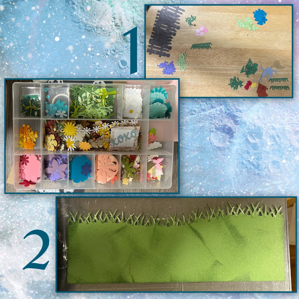 1- die cut pieces from the Fence add on , the fence is cut from a wood grain patterned paper, flowers and greenery. Fun Flowers, and the Garden charms , I also dug out some flowers that I had precut.