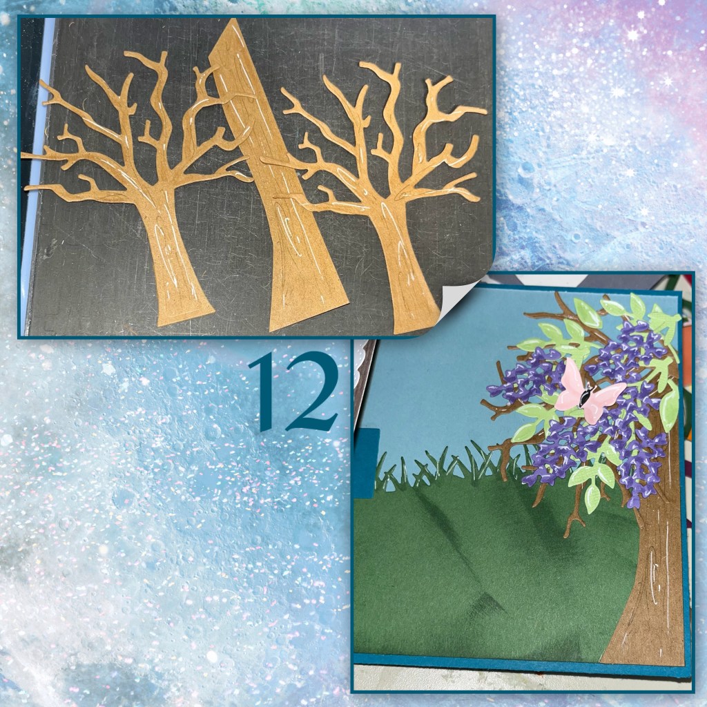 12- I cut a couple of trees from the Tree pop up, and a free I handed the trunk, also added a few pen details. I add the tree pieces and and the purple flowers , leaves and butterfly to make a lilac tree.