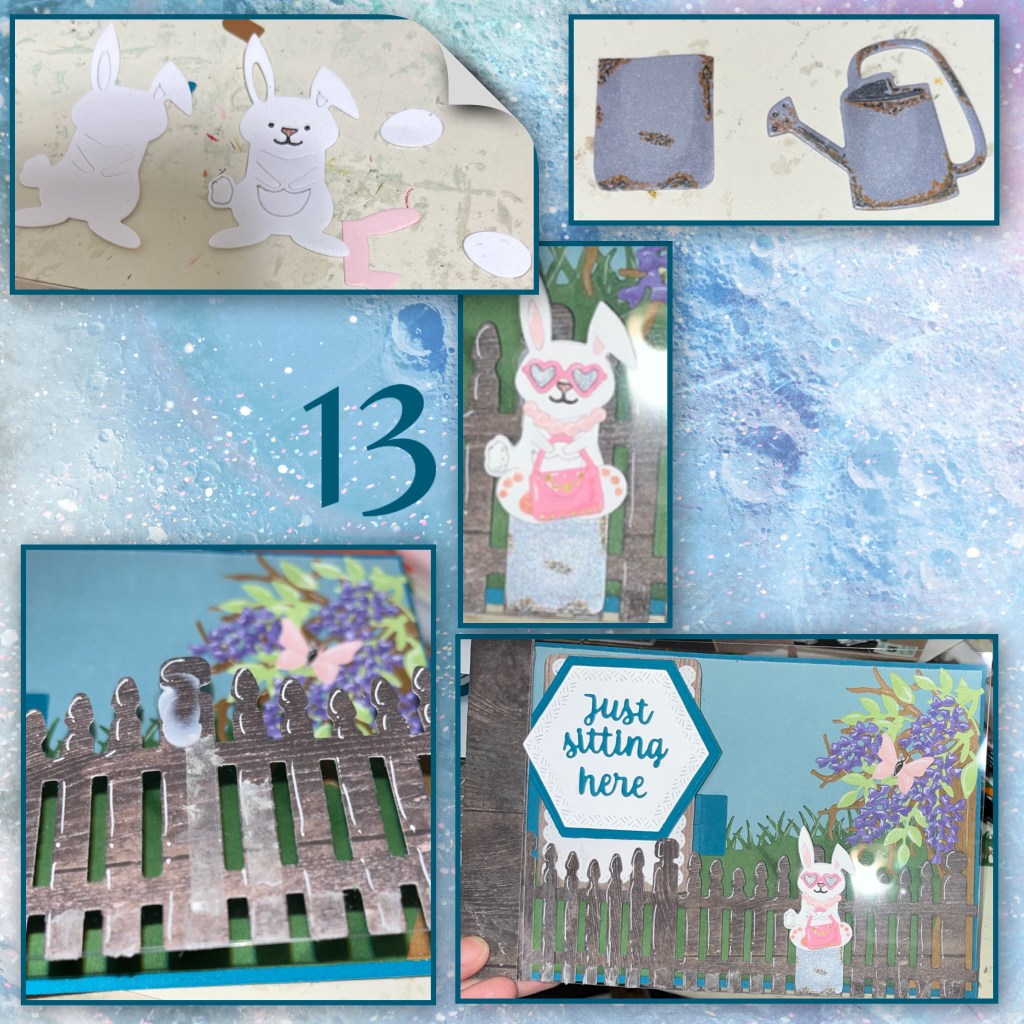 13- the Rabbit is from the Spring animals dieset, I double him so he would have a white back. I also cut 2 eggs that I will turn into feet. To make rust on the watering can and the can, I added little black and brown spots with fine point pens. I glammed out the rabbit using pieces from the Tiny Accessories 2