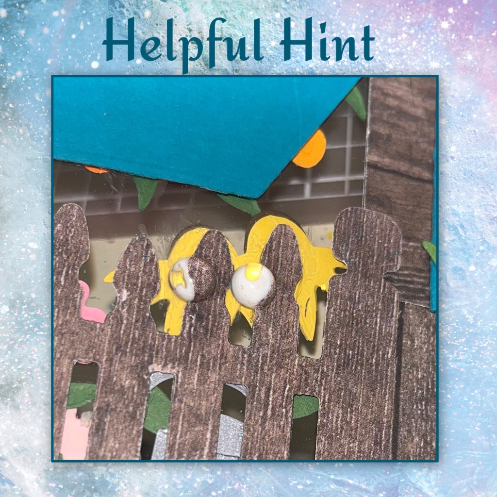 14- I added all the flowers and accessories to the front and inside. Continuing to try to hide the adhesive between the flower and the fence post. I also added the 1/2 Hexagon for a place to sign.