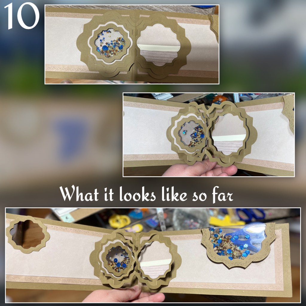 9a- I diecut the Paper Frames Pop up and used some of the other dies in the set to decorate. On the right side I used a wood grain paper to make a floor and I white strip of paper to make baseboard.