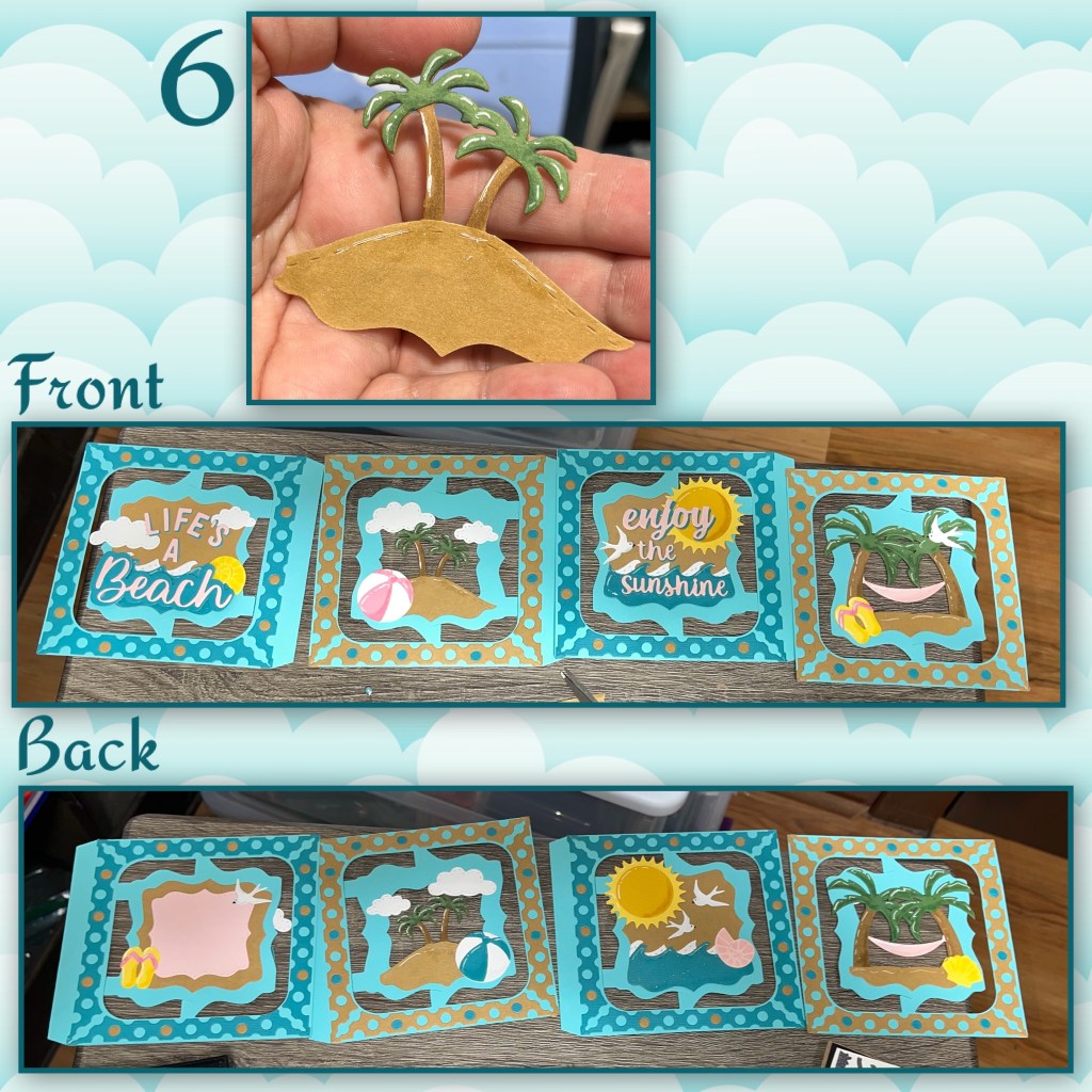 B- Tropical Scene, I cut the island and trees from 3 different colours (beach sand, tree trunk and leaves) twice, the waves from blue and white twice, and then I cut the bottoms with a Fancy Label frame so they fit nice on the panels.