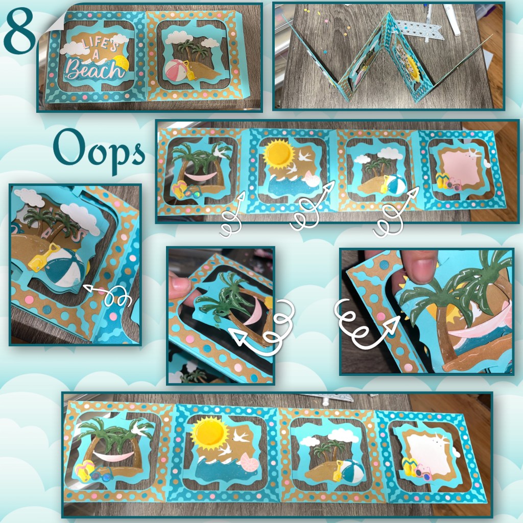8- I started adding the panels together to make the accordion and realized my mistake. Everything looked good from the front but I had covered up part of the frames and some of the elements. It was easier to just cut a few more of the frames and added over the flaps and I peeled up some of the die cuts and glued them over where the tabs attached. I added some of the little sea shells to cover where there was glue showing.