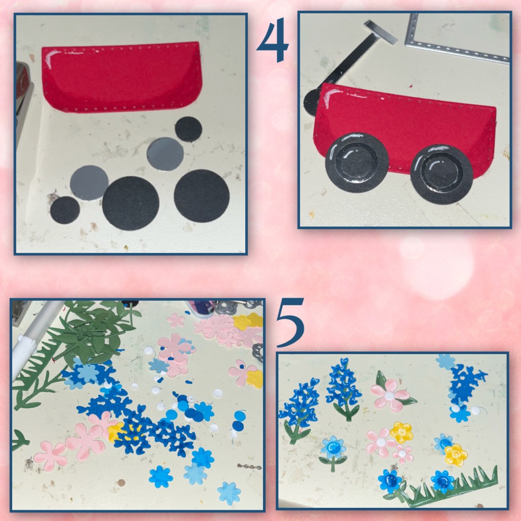 4- to make the wagon I diecut a red rectangle from the Slim frames, I used an old Creative Memories corner rounder to cut the 2 bottom corners. The Wheels are Black 3/4” and 3/8” and silver 1/2”. Layered black silver black. I used the 3/8” punch to make a small silver circle and silver strips to make the handle. I coloured the bottom of the waggon with Versa Marker and added some white highlights.