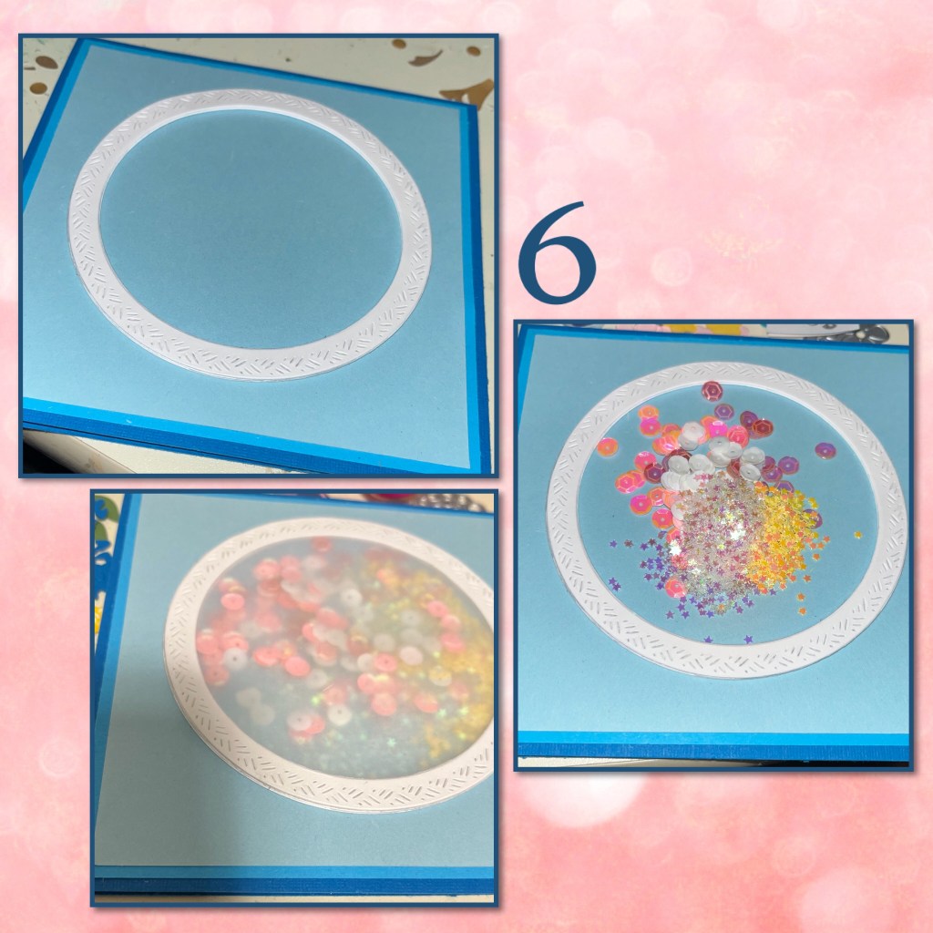 6- I added the shaker ring to the middle of the card. I went through my stash and found some pink and white sequins and some yellow and iridescent stars and added them to the card. I closed it with the vellum circle.