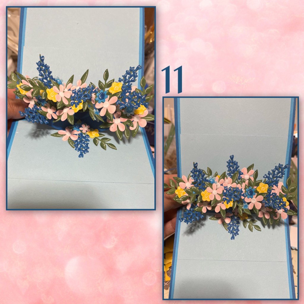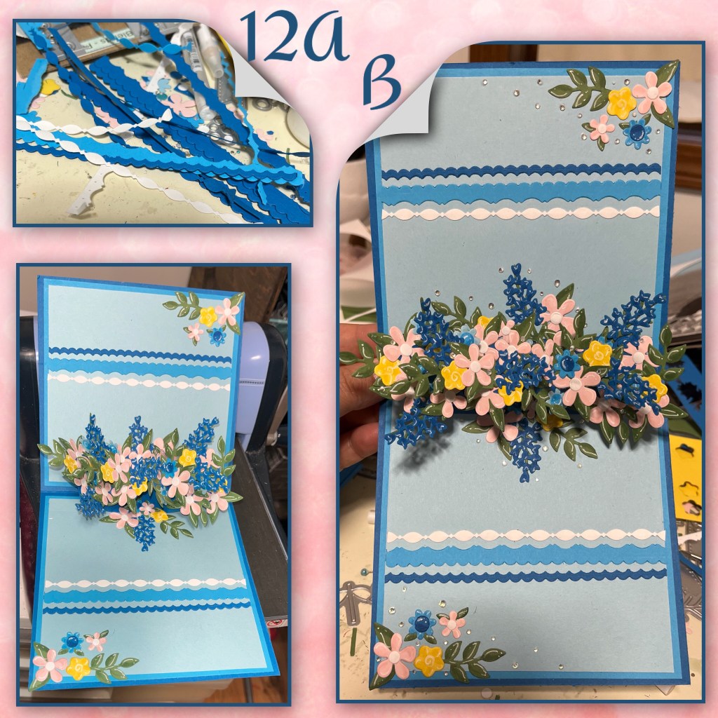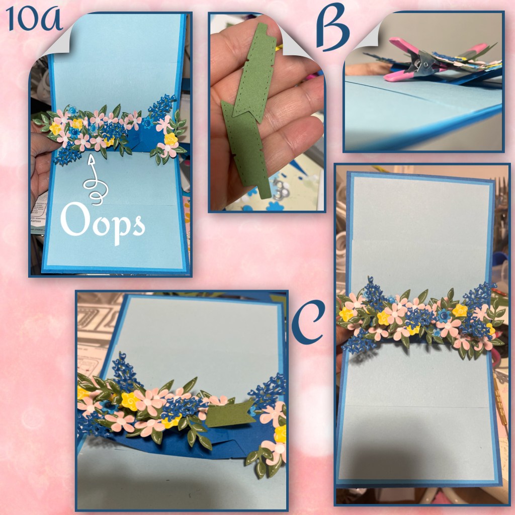 10A- I continued to add flowers when I realized I had forgotten to add the banner arms. I decided to cut them in green so any sections that would be peaking through would look like leaves. If I was making this again I would make the long panel that I trimmed in green as well. It is tricky to add the banners after the mechanism is attached to the card but not impossible