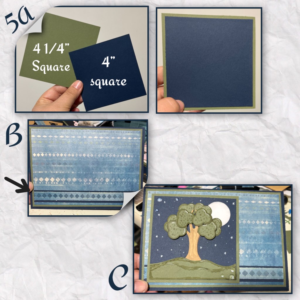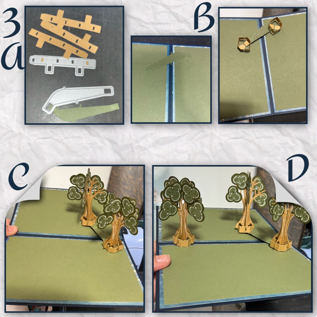 B- add the 2 panels that are the same inside the card and add the fold splitter and 2 tree bases as shown (Karen has a video tutorial on the product page at the link ⬆️ )