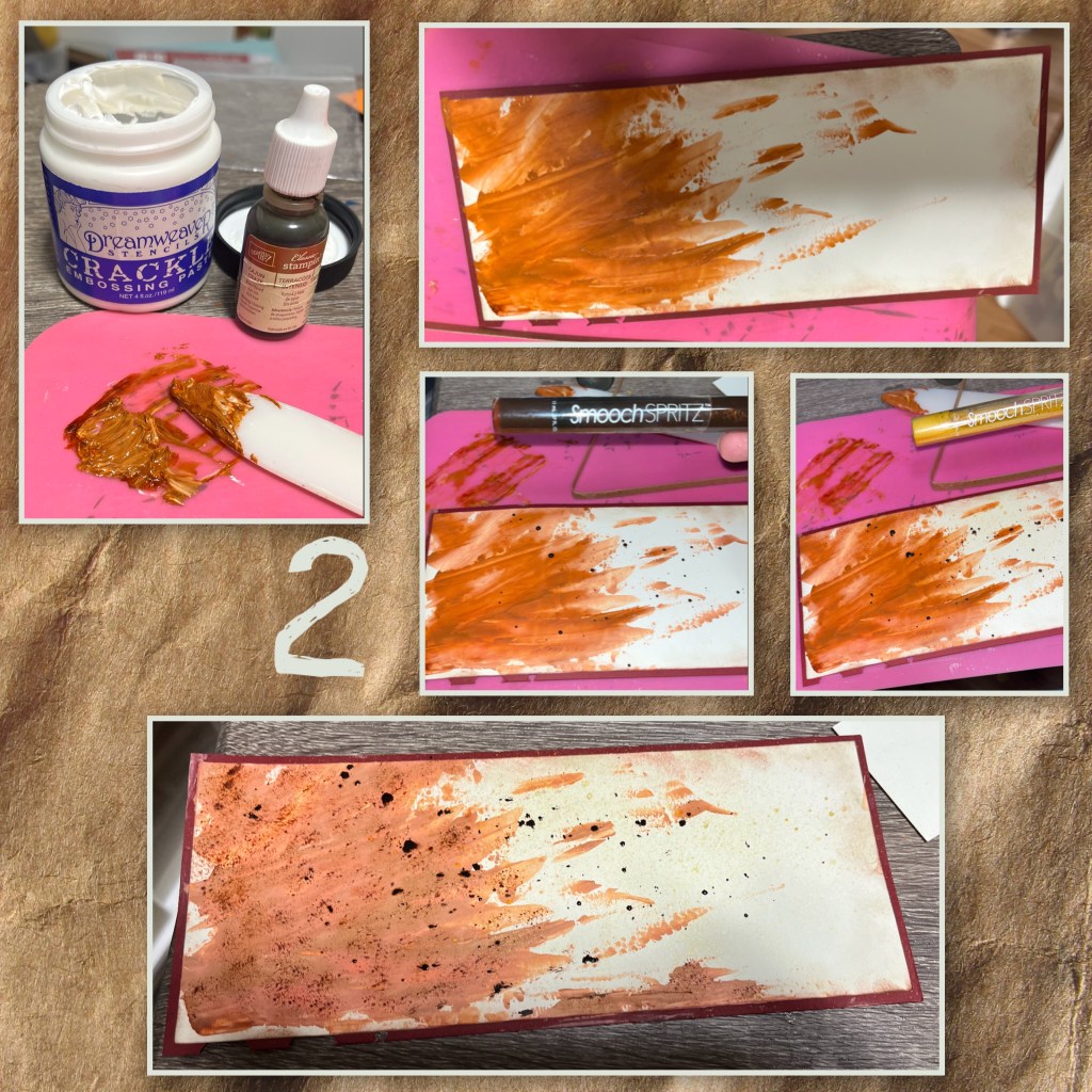 2- I mixed some Cajun Craze ink with Crackle embossing paste and then spread it across the vanilla panel as shown. I spritzed some brown and gold Smooch Sptitz on the panel. I was hoping the embossing paste would crackle but I think because I added the ink it changed the consistency so when it dried it did not crackle. I still like the look. I added it to the red panel before adding the paste and spritz, If I were making this card again I would have finished the vanilla panel before adding it to the red panel.