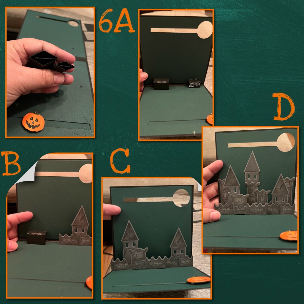 C- add the black circle with the foam tape to the bottom channel with the black circle on the back of the card. Add the jack-o-lantern to the foam tape.