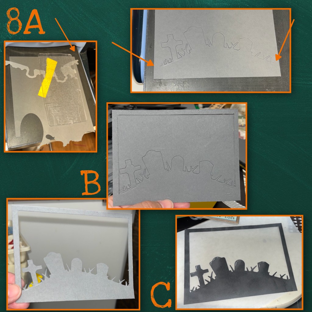 8A- using a piece of grey cardstock that is 5” wide lay down the graveyard die. I used a small cutting pad and made sure to leave a margin on the each side I did run it through for each side separately to make sure I had 1/4” margin