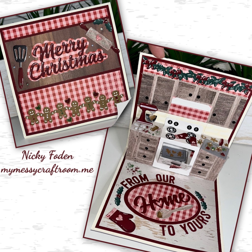 Hello crafty friends, it’s time for the Karen Burniston Design team challenge and this months challenge is “What’s Cooking?” and we were to use the Oven Pop Up dieset on our cards. I decided to make it a bit rustic, and I thought it would be fun to make a bit of a mess, if I were baking there would most defiantly be a mess. This is what I came up with.