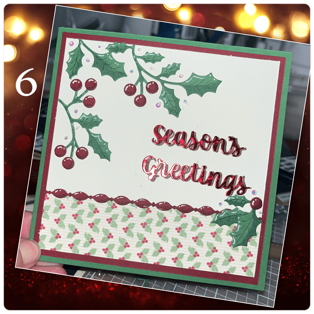 6- using Wordset 3 Holiday I die cut “Seasoms Greetings” from the red mirror cardstock and the woodgrain cardstock and layered as shown and added it to the card front. I added a some more Holly, berries and gems.