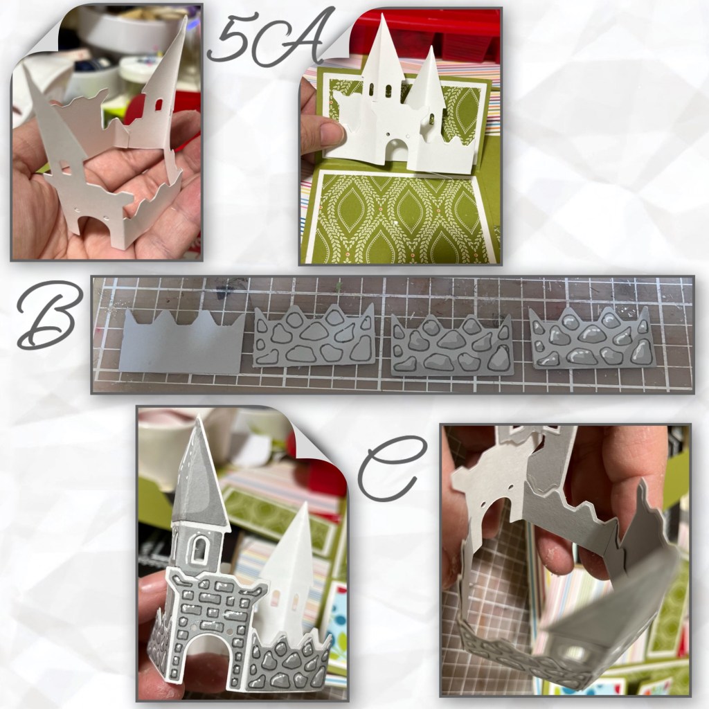 5A- I thought my princess would need a castle, but I wasn’t sure it would fit. So I cut out a white Castle Pop up and checked if it would fit. It does but it does hang below into the area under the second flap. But I’m ok with that. (Karen has a video tutorial on the product page at the link ⬆️)