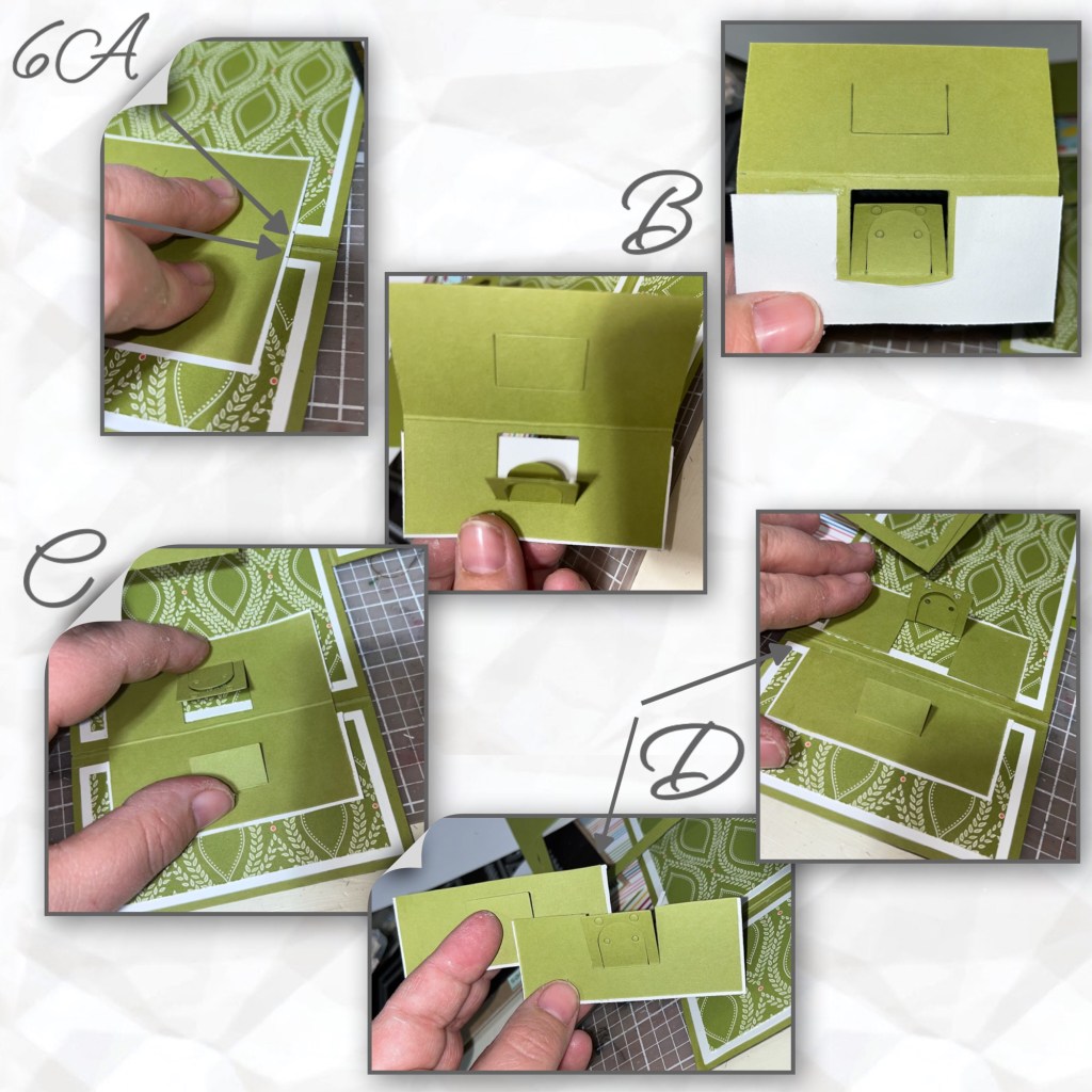 6A- The green piece that the mechanism will be cut into was just a scrap I had laying around and I did not measure it. It has to be big enough to fit the mechanism and score in the middle as shown. I took a white piece of card stock and put it behind the green so it would have matting around the green piece, do not glue it yet. I marked with a pencil where the white mat from the bottom layers meet this new layer and marked it on both pieces. This is how I will make sure my mechanism is lined up properly.