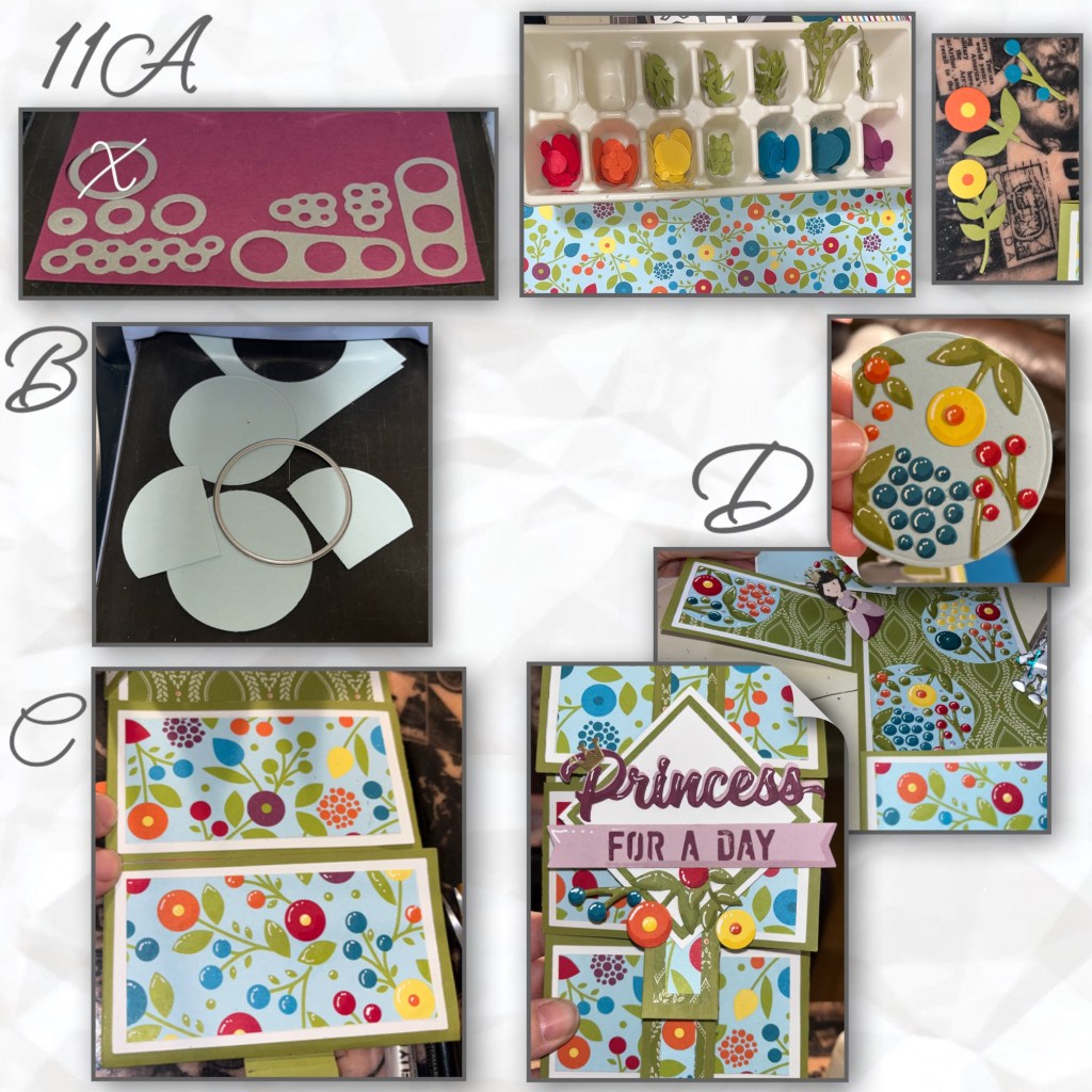 11A- The pattern paper is retired Stampin’ Up! paper. I wanted to make flowers to match so I went through my stash and pulled out the different colours of card stock that I have that match the paper. I use multiple die circle dies to cut out the different size circles. I also cut out leaves and branches from the following sets. Flower Pop up, Woven Basket, Fun Flowers, and Coffee Cup Pop up. Yes I use an ice cube tray to sort my colors. I started assembling flowers to match the flowers in the pattern paper.