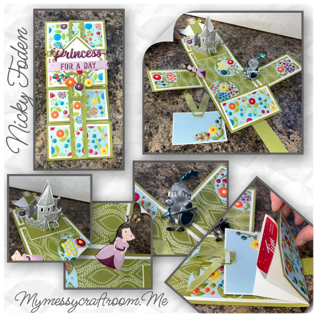Now I think I was pretty clever with how I used an envelope, I actually cut one in half and made it a gift card holder under the bottom flap. I think the bright colours would be perfect for a party. I have 2 crowns, one on the “P” on the front of the card, and one on the princess that is inside the card. The 3 strips of paper were used to makes the verticle belly ban. Green cardstock, green patterned paper, and flower the paper. So for my personal challenge I used the Slim Flaps and Frames and the Mini Pops for the mechanisms I haven’t used in a while, and the Word set 5- Royalty for the die set I’ve never used before.