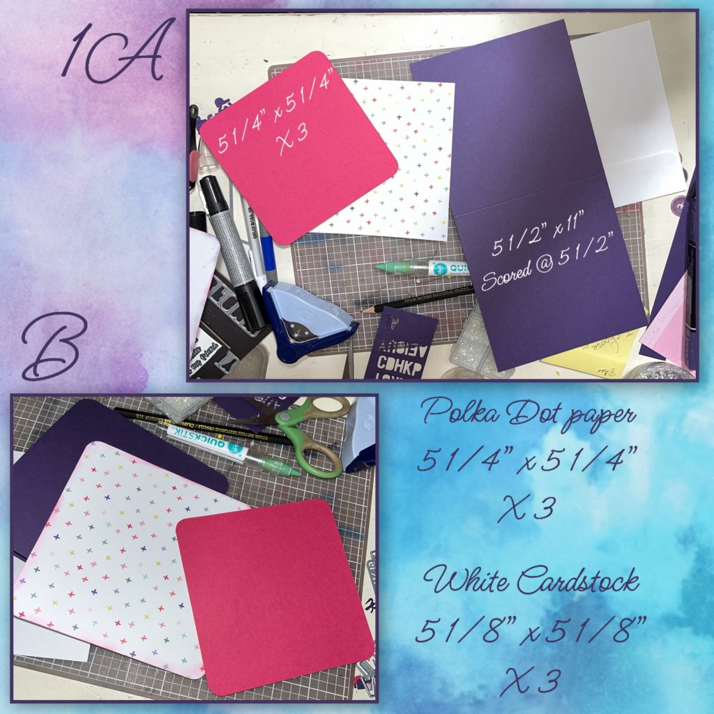 B- I used a corner rounder (mine is a 22 year old Creative Memories version) and rounded all the corners of the panels and the card. The cardbase was too thick to punch through so I punched it enough to make an impression then cut it out with scissors. I also sponged the pink and purple ink around the edges of the patterned paper and the white paper.