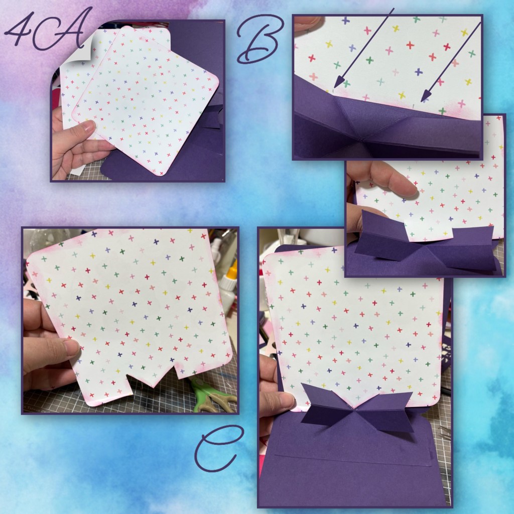 B- add the white panels to the pink panels and then add them to the card the same way as step 4. But opposite angle to the pattern paper.