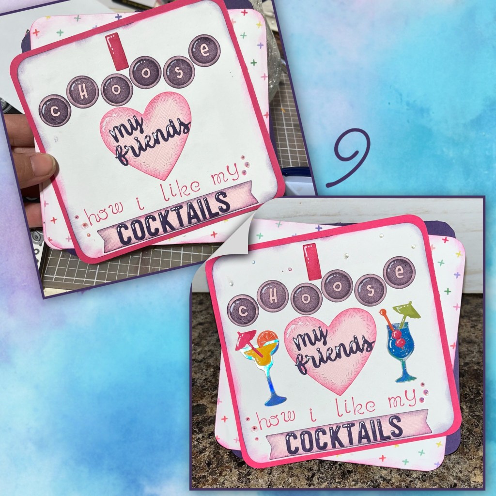 2- I was looking for a quote so I googled “Friends and Cocktails”. I really like the look of mixing fonts when I do longer quotes, for this I used a mix of stamps and dies. Alphabet (large pink letters), Mini Alphabet and Numbers (dark purple letters), Word set 1 greetings (my friend s), Heart Crosshatch , the round letters and the other stamped letters are retired Stampin Up sets. The long banner is from Word set 5 Royalty . I adhered and stamped everything down with the exception of the word “TWIST”. I added shading with a Versa Mark Marker, and highlights with a white Gelly Roll pen
