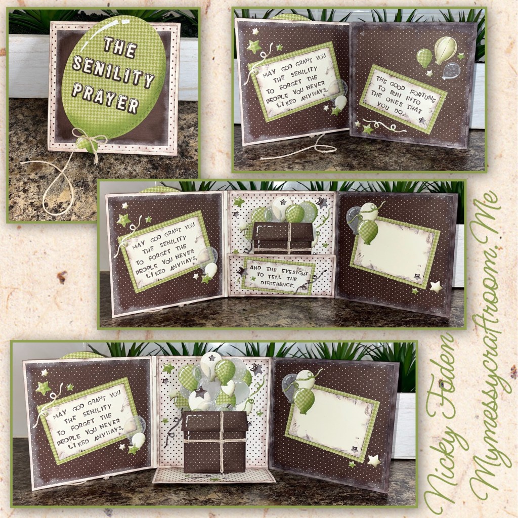 This is how I met the parameters. Trifold is three folds, I have one on each side and one on the bottom. Sleigh Ride colours, trees and snow can be seen on a sleigh ride. I googled jokes for older men and found this one. And the balloon on the front is way bigger than the rest so it is out of proportion.